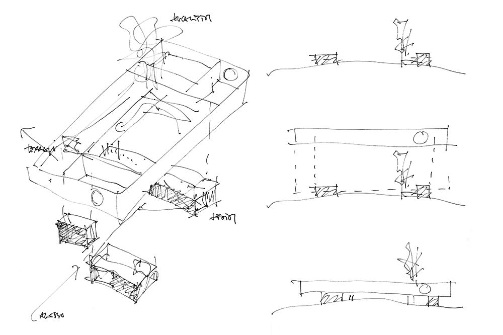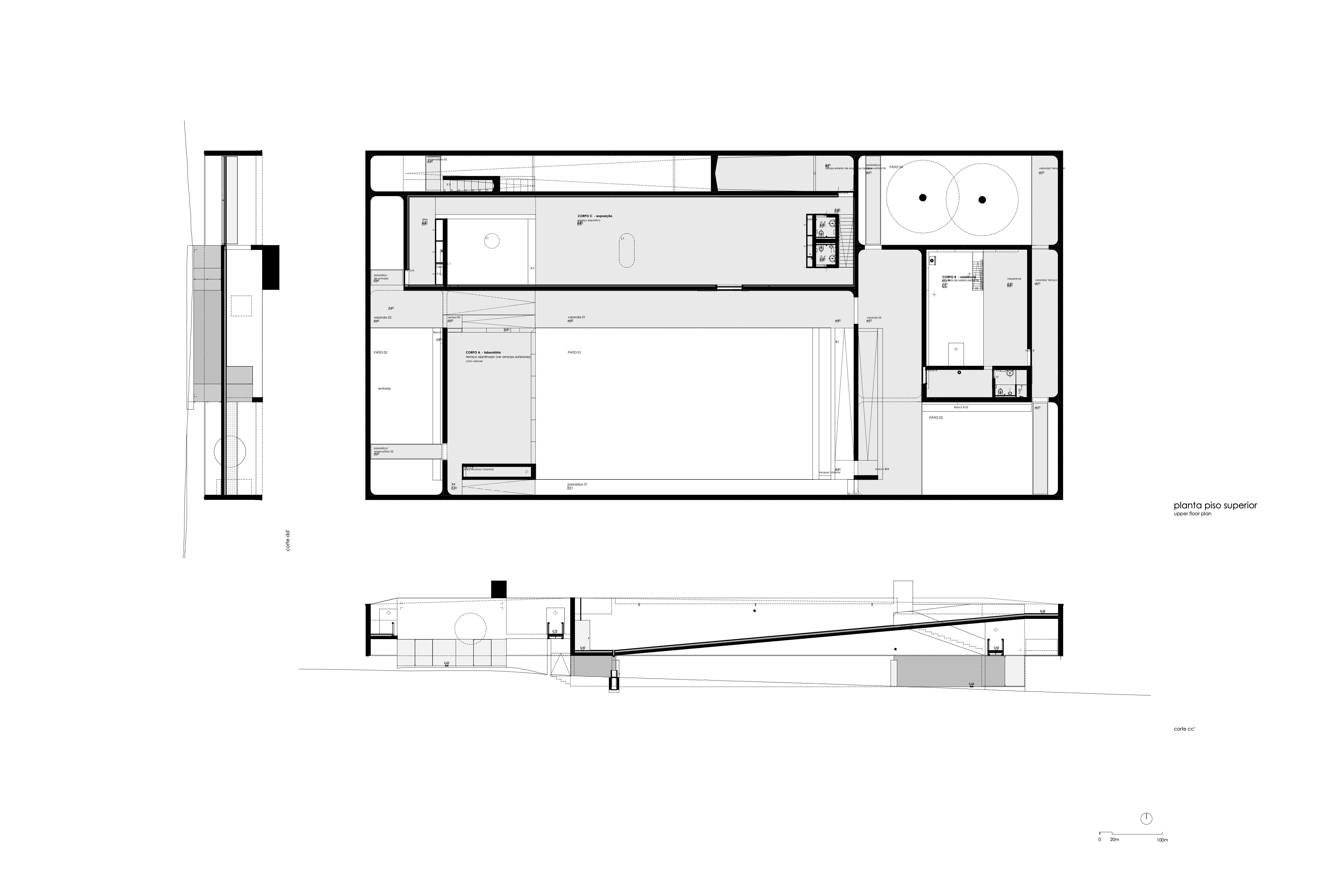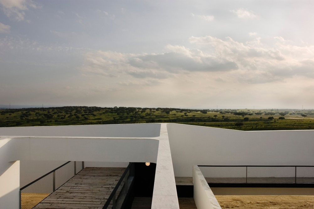 The construction is suspended a meter above the more raised quota of the land, defining private patios around the building of the residence and designing and entrance, on the opposite side of the 55 x 27,5 meters rectangle, where the land became lower. The center of the set is marked by a bigger patio, which organizes the other buildings, covered exterior spaces and pathways of the station, around it. At the ground, the suspended plans fit long horizontal views of the surrounding landscape. Because of it’s extreme isolation, the station as to remain self-suficient in terms of energy and water supplies, what it is possible due to the photovoltaic panels set in the roofs, and by a deposit that stores the rainwater.