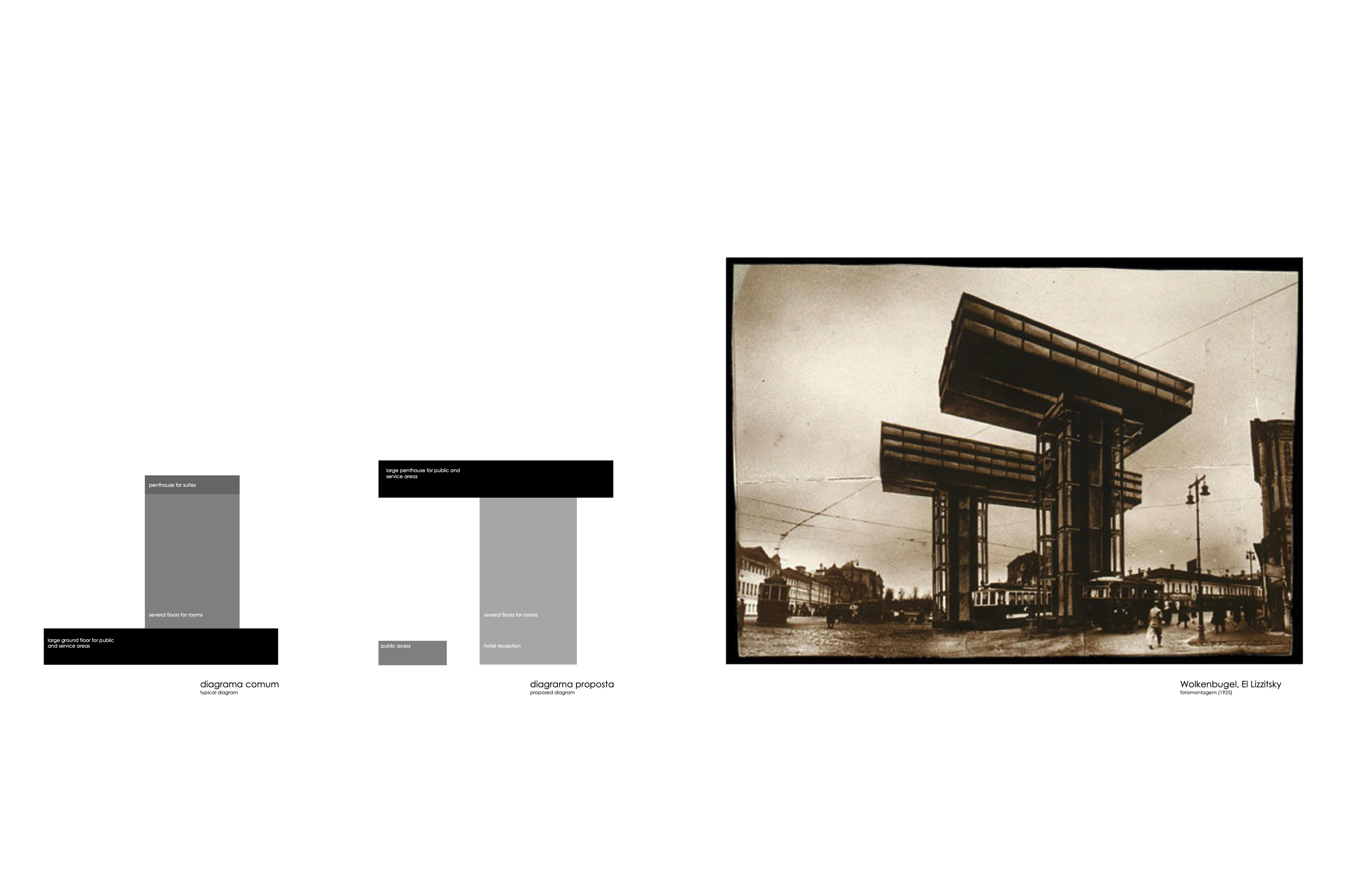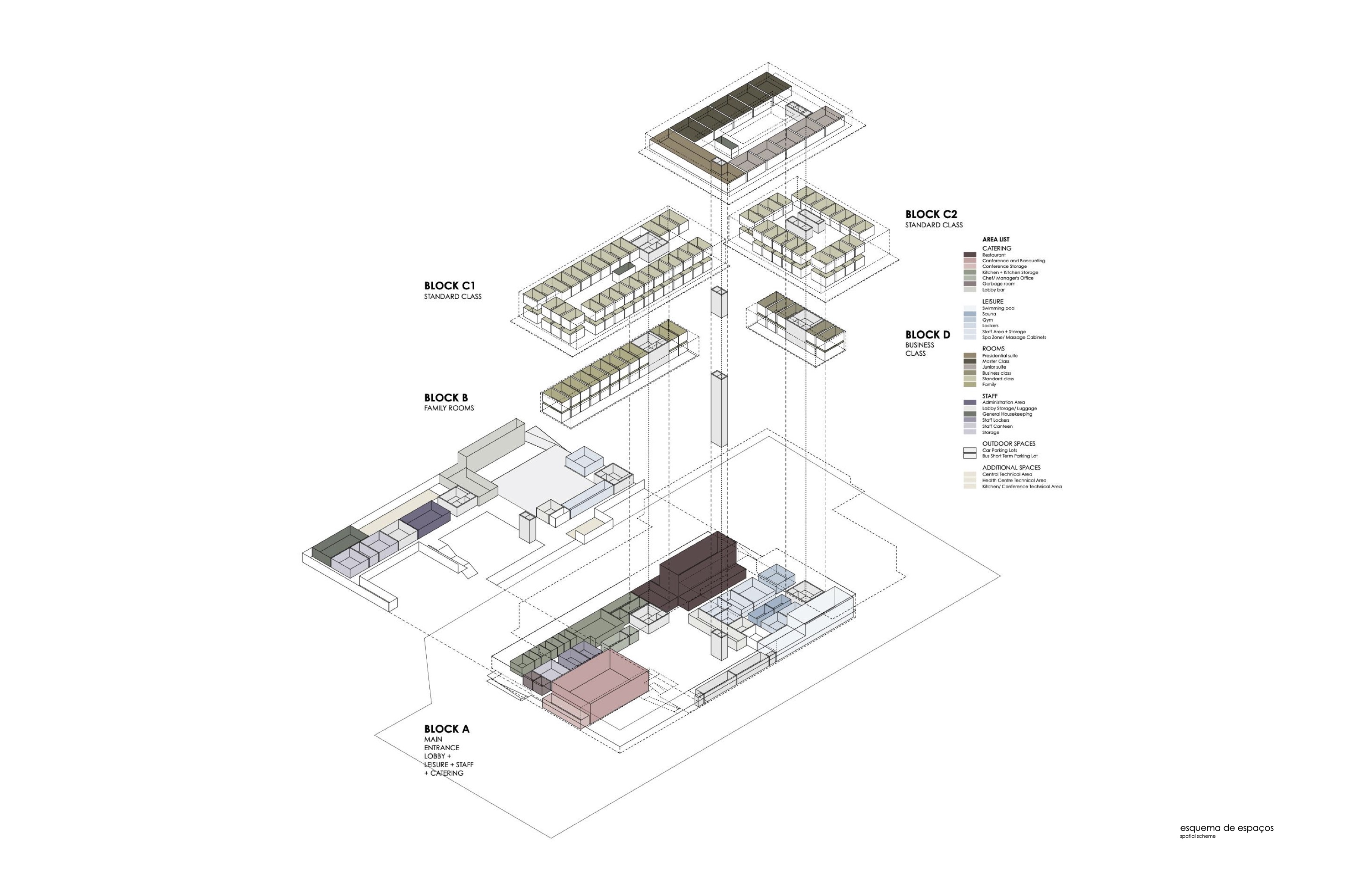 The organizational scheme proposed is, in a way, opposite to the traditional hotel scheme, like the pre-existing building, which is normally based on the disposition of a horizontal block housing the public spaces and areas of greater dimension, opposed to a vertical block which organizes the rooms, in a hierachical form.